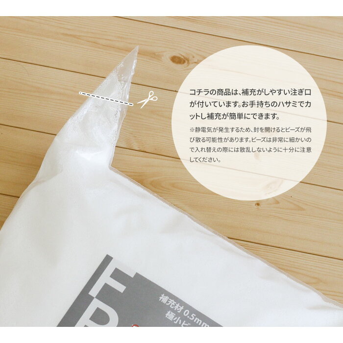 ビーズクッションを長くご使用頂くための必須アイテムです! 直径約0.5mmの砂のようにサラサラな細かい発泡ビーズは座るたびにビーズが流動し、 体勢に合わせてクッションが変形するため身体に吸い付くようなフィット感が生まれます。